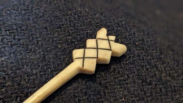 The original thistle pin from Coppergate is made from bone and is really asymmetrical and irregular. I made this one in antler which is far more durable, and tidied things up a bit because I like symmetry far more than the Vikings did. ~7cm