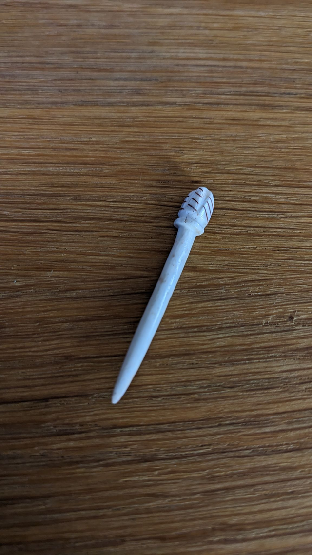 Small antler dress pin, based on a Coppergate example, with a vaguely acorn shaped finial and decorative red linework.