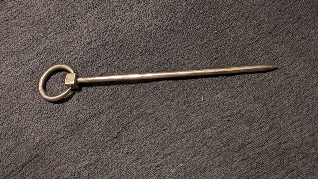 A Coppergate style Hiberno-Norse brass ring pin with a slightly domed polyhedral terminal. ~17cm