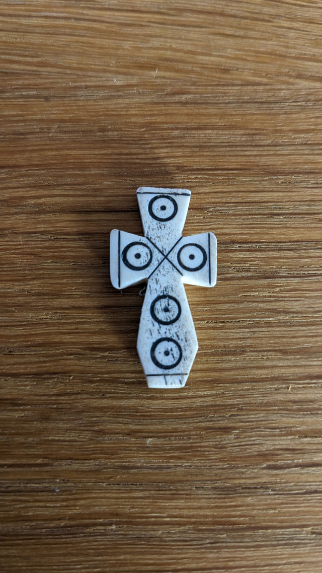 Double sided reliquary cross with red and black linework, based on a larger Byzantine example. 4cm