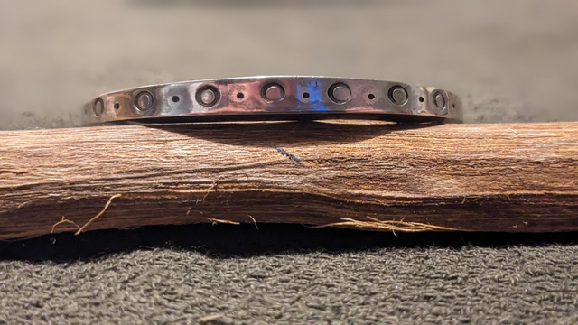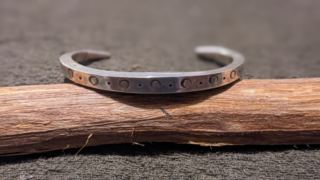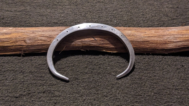 Hand forged arm ring with stamped decoration, made from recycled scrap silver jewellery. Very Viking. Internal 6cm width, for a small to medium sized wrist.