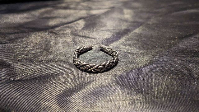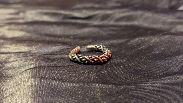 A complicated little reverse twisted silver ring, adjustable. (Look under "arm rings" for a matching big sister)