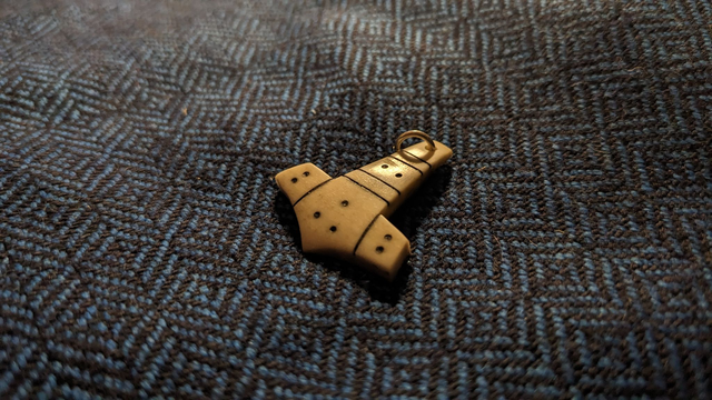 An antler Thor hammer pendant with simple decorative line and dot work, in a broad style traditionally associated with Finnish hammer pendants.
