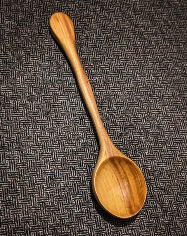I really enjoyed carving this spoon, it took most of a day but I had a nice time working on it. I can't quite remember which wood it is, but it's dead pretty and I thought "this piece of wood really wants to be a nice spoon". Polished up nice and shiny, buffed with oil and beeswax. About 17cm long, good for scooping coffee or spices or other dry uses so it doesn't go fuzzy.