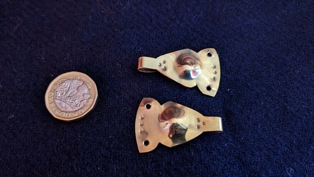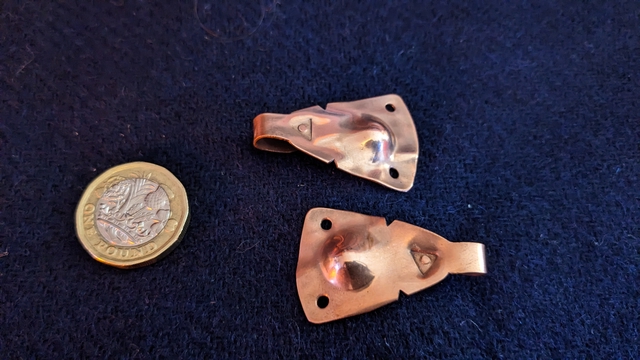 Hooked tags, based on a Coppergate example, presumed leg winding hooks. The hooks on these examples are broad, so I recommend fitting an attachment loop or using on loose woven material.