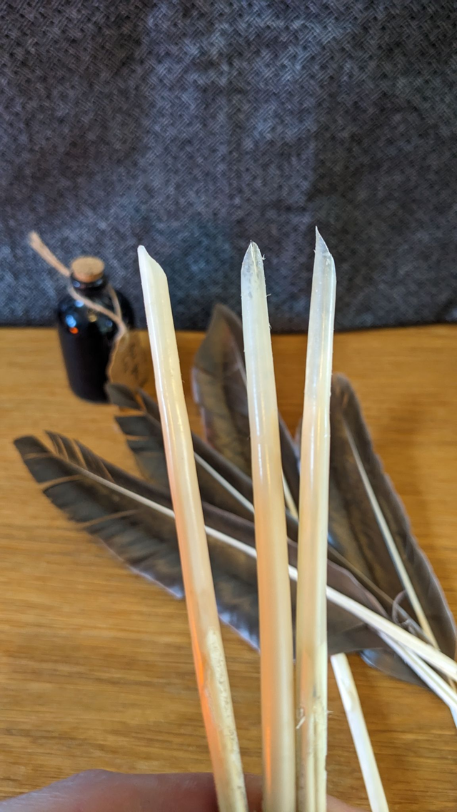 Feather quills for fancy writing projects. The nibs are cut to various sizes and are easy to cut flatter or sharper depending on your style. Historically, there should be far less feather, but I don't find the feathers get in the way and they're much more fun like this.
