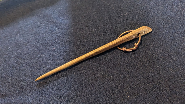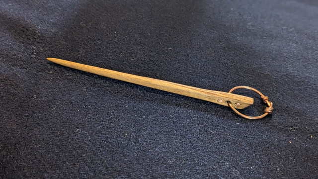 A polished hardwood pin with decorative copper studs and a large copper knotted ring. Pin 13cm, ring 3cm