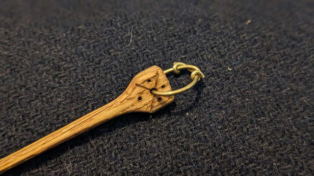 An adorable miniature hardwood dress pin with line and dot work and a brass ring. More decorative than functional. Pin length 5cm